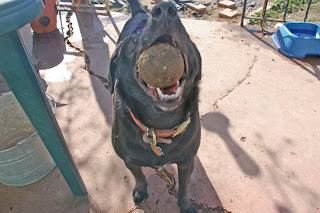 Step5: First clean off your ball. All that dirt starts to taste funny on you ball after awhile. DO NOT hand the ball to Mom right after coming out of the water dish. She doesn't like that and will ignore you until the gooey feeling in her hand goes away. Bounce it on the patio a few times to get the excess water off, THEN hand it to Mom for more throwing.
